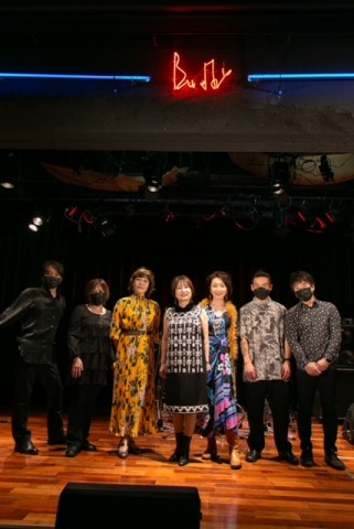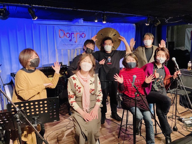 写真は左からギターコンちゃん、ピアノ&ボーカル&バンマスYUKAさん、私、美也子さん、主宰の亜樹さん、ドラムヤッスー、ベース杉ちゃん